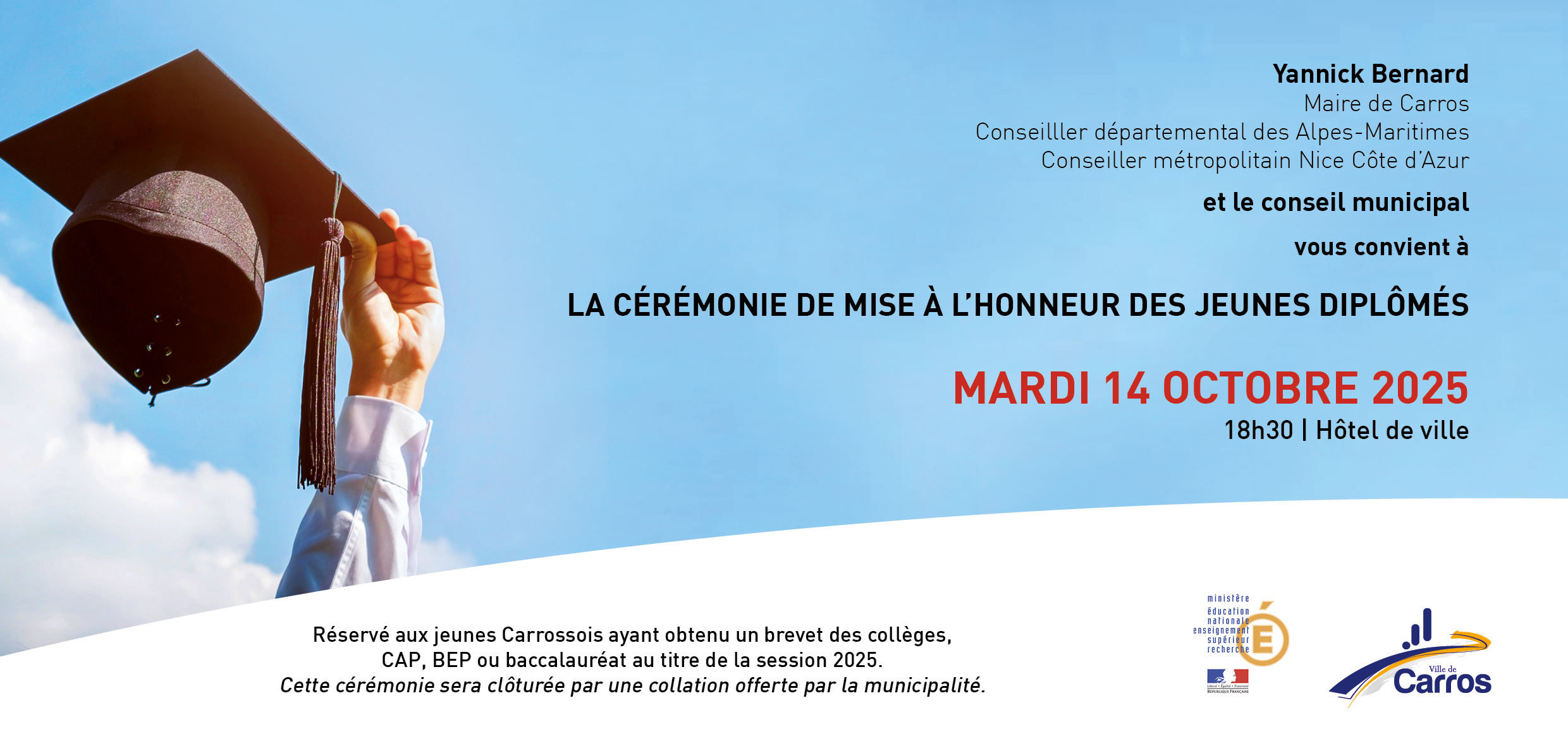 Elle aura lieu le mardi 14 octobre 2025, à 18h30 en salle du conseil municipal, à l'hôtel de ville de Carros. À cette occasion, les nouveaux diplômés se verront remettre un cadeau. La ville de Carros octroie également une récompense financière aux nouveaux bacheliers ayant obtenu la mention BIEN ou TRÈS BIEN.